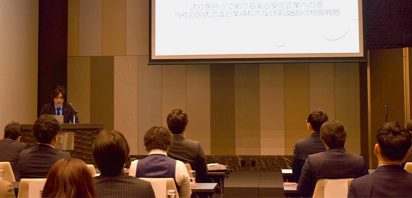 ここでは、今期の業績振り返りや今後の方針、目標などが共有され、ホテルの会議場を借りて開催します。